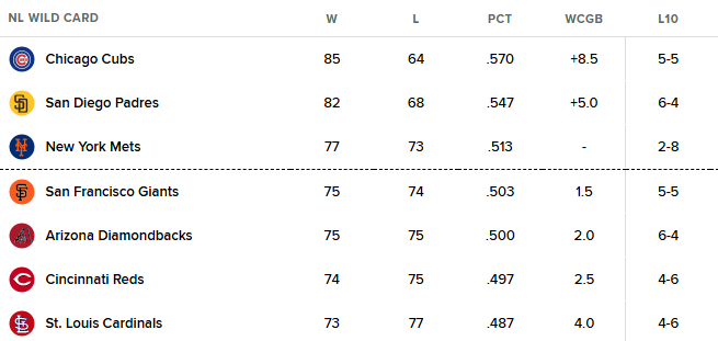 Realistically speaking, only the final Wild Card spot is in play for the D-backs. They are 10.5 games back of Chicago for the top spot and 7.0 games behind San Diego for the second. Passing either club is unrealistic, so only the final spot is truly in play for Arizona.