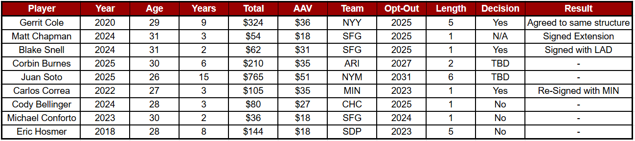 Of the seven players whose opt-out would have or already triggered, three of them did not opt out (Hosmer, Conforto, Bellinger). Two more opted out and stayed with the same team (Correa, Cole), another signed an extension (Chapman), and one departed for another team (Snell).